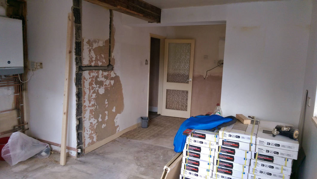 Major kitchen renovation. Included moving all services, removal of a wall and blanking an exterior door, installation of a support beam, fully tiled floor, spotlights and at the customers request a low level kitchen with no wall cabinets.